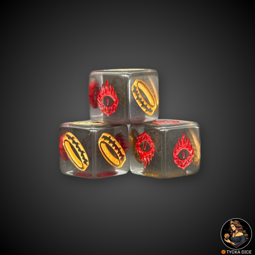 Featuring three faces representing a ring and three faces representing an eye, this die is ideal for resolving 4+ decisions, commonly used in wargames and narrative scenarios to determine which side prevails.